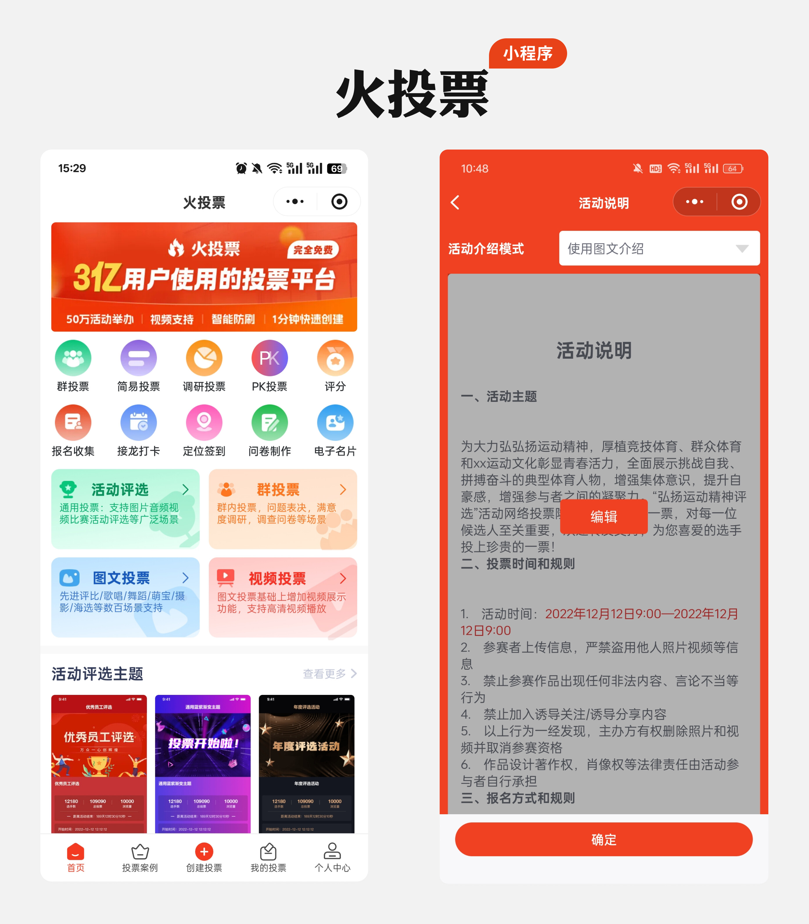 首页展示“活动评选”“视频投票”“群投票”等分类,根据场景选择模板。